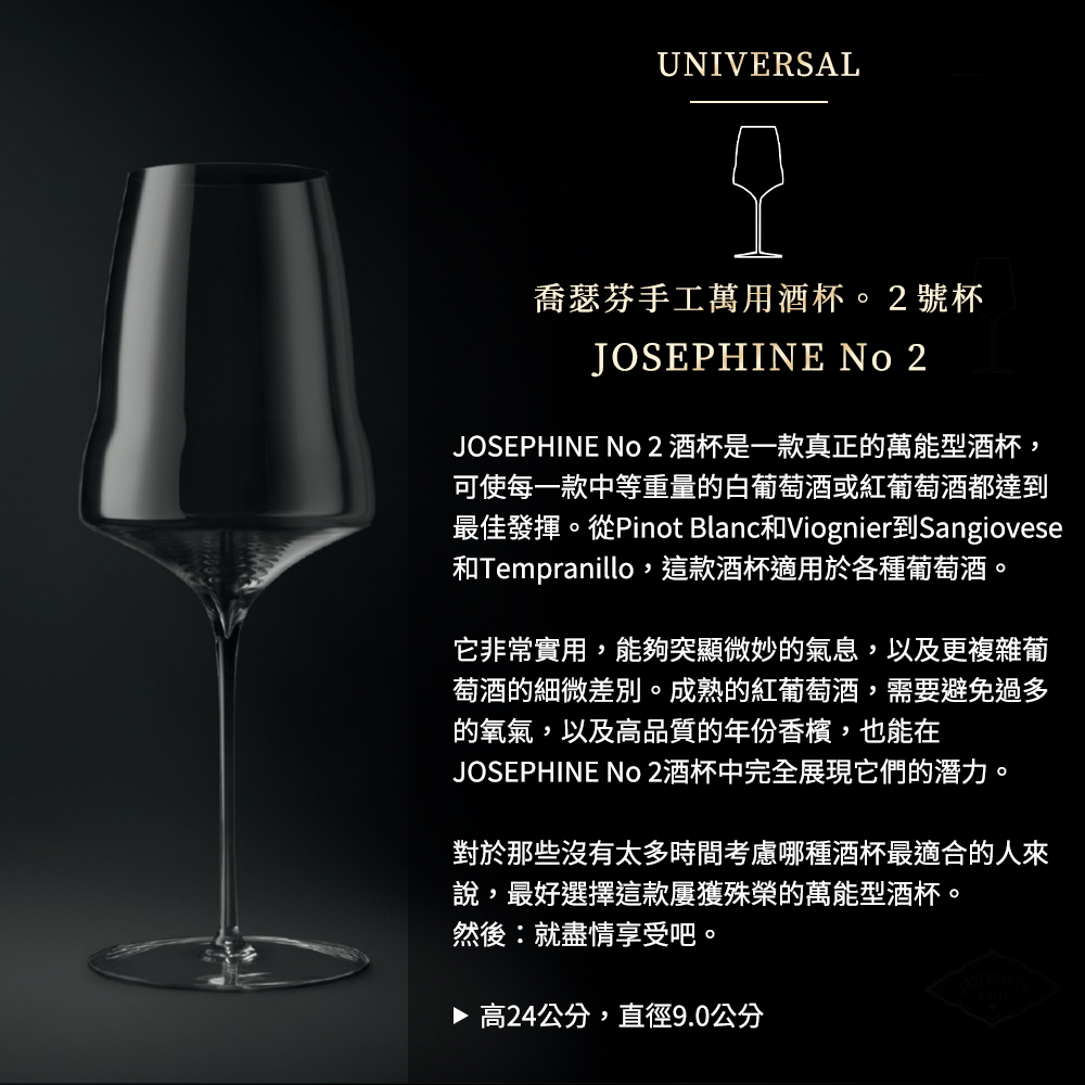 JOSEPHINE No 2 酒杯是一款真正的萬能型酒杯,可使每一款中等重量的白葡萄酒或紅葡萄酒都達到最佳發揮。