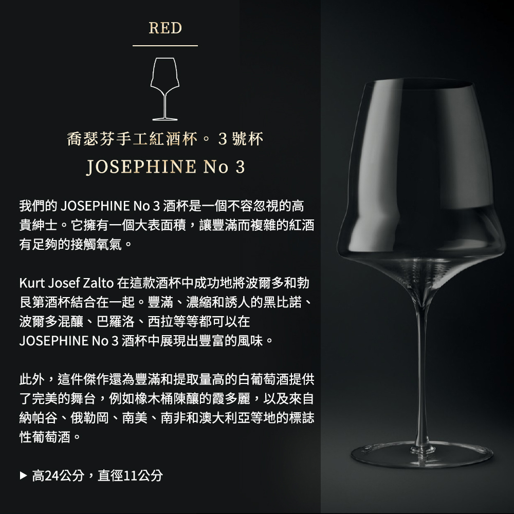 Kurt Josef Zalto 在這款酒杯中成功地將波爾多和勃艮第酒杯結合在一起。豐滿、濃縮和誘人的黑比諾、波爾多混釀、巴羅洛、西拉等等都可以在 JOSEPHINE No 3 酒杯中展現出豐富的風味。