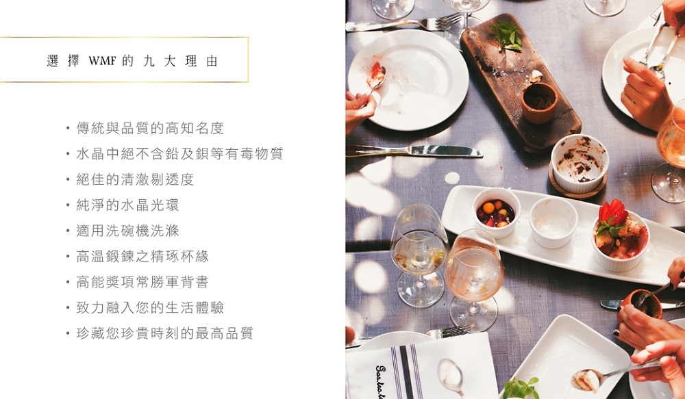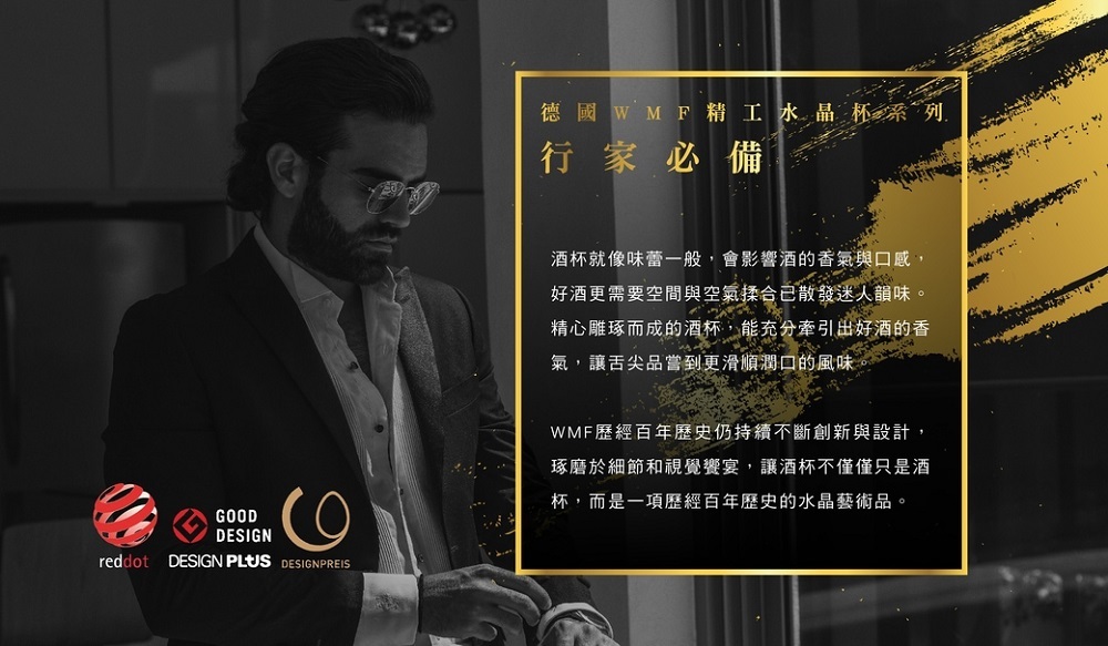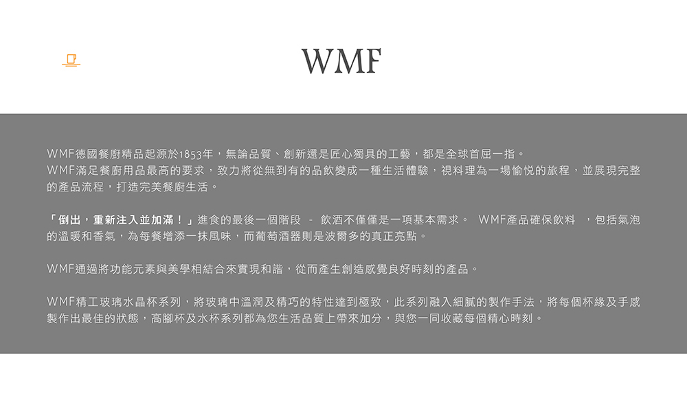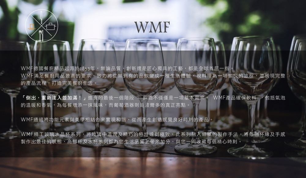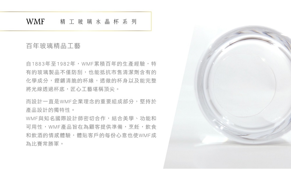 WMF 精品玻璃水晶杯系列,將玻璃中溫潤及精巧的特性達到極致,將每個邊緣及手感製作初最佳的狀態。